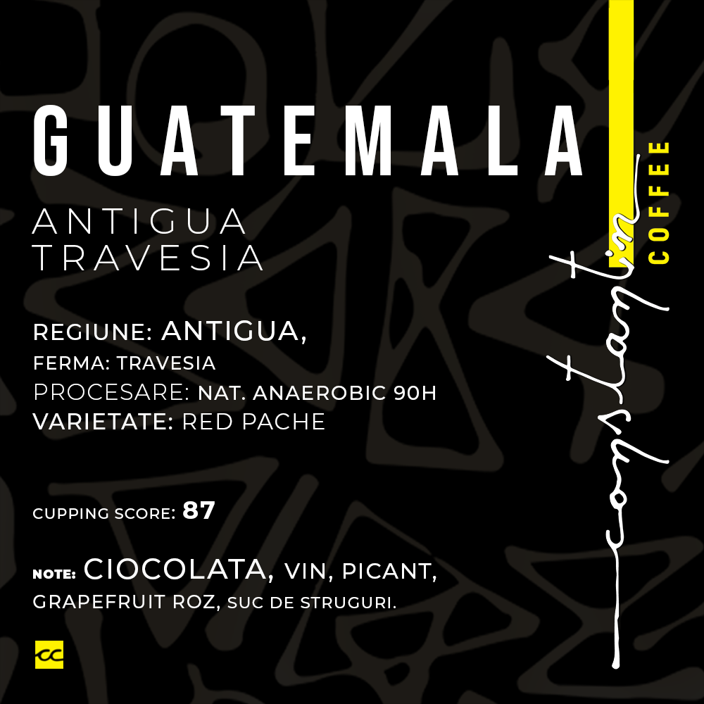 SCA Score: 87 Soi de pache natural, macerat carbonic timp de 90 de ore, Împrumutând din procesarea vinului, această fermentație anaerobă aduce un profil gustativ unic și fructat care accentuează profilurile tipice clare și curate. Guatemala este patria unora dintre cele mai iubite și mai importante cafele de pe planetă. Producția a început la mijlocul secolului al XIX-lea și reprezintă un element important al economiei țării. Guatemala găzduiește sute de microclimate, ceea ce permite cultivarea și recoltarea unor cafele de specialitate deosebite. Munții, solurile vulcanice și vremea ploioasă creează condițiile ideale pentru cultivarea cafelei și a devenit una dintre preferatele fanilor multor băutori de cafea din întreaga lume. Cafeaua este cultivată în principal la umbră și la altitudine. Santa Rosa FERMA TRAVESIA Pedro Echeverria este proprietarul fermei. Ferma este situată în Regiunea Antigua, Ciudad Vieja, Guatemala.La Travesia este o fermă unică, care merge de la 1.600 de metri deasupra nivelului mării la peste 2.000 de metri deasupra nivelului mării. „Travesia” înseamnă „călătorie” în spaniolă. Acest nume a fost ales datorită drumurilor lungi și întortocheate din plantație care duc nu numai printr-o fermă de cafea, ci și printr-o rezervație naturală forestieră. Cafeaua din această fermă este transferată la Finca Capetillo, unde este procesată la cele mai înalte standarde de calitate. Boabele de cafea remarcabile din Travesia sunt cultivate într-o zonă ocupată de trei vulcani, care creează condiții ideale de creștere pentru fermieri. Travesia a participat de mai multe ori la concursul de cafea APCA și a participat și la licitațiile Cupei Excelenței. Cafea de specialitate atent selectionata.
