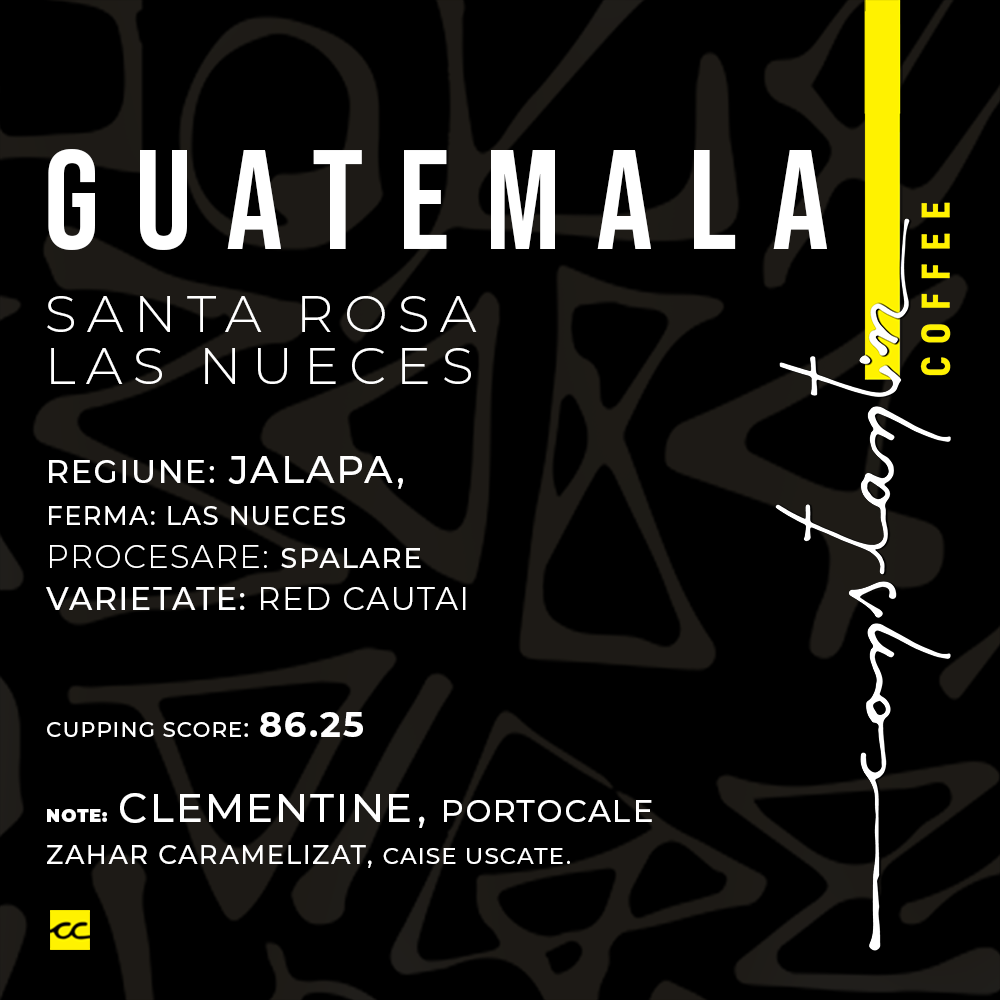 SCA Score: 86.25 Guatemala este patria unora dintre cele mai iubite și mai importante cafele de pe planetă. Producția a început la mijlocul secolului al XIX-lea și reprezintă un element important al economiei țării. Guatemala găzduiește sute de microclimate, ceea ce permite cultivarea și recoltarea unor cafele de specialitate deosebite. Munții, solurile vulcanice și vremea ploioasă creează condițiile ideale pentru cultivarea cafelei și a devenit una dintre preferatele fanilor multor băutori de cafea din întreaga lume. Cafeaua este cultivată în principal la umbră și la altitudine. Santa Rosa Situată în regiunea central-sudică a Guatemalei, valea Santa Rosa este renumită pentru solurile vulcanice bogate în nutrienți care creează un climat ideal pentru o cafea cu o maturare mai lentă, despre care se spune că concentrează gama de arome. LAS NUECES Don Amildo Morales s-a căsătorit la vârsta de 27 de ani cu Laura Angelica Gonzales de Morales și a întemeiat o familie. In 1986 au cumpărat prima fermă numită Las Nueces de la verii lor și au călătorit la Fraijanes pentru a cumpăra prima sămânță de cafea pe care să o planteze. Câțiva ani mai târziu, au plecat în El Salvador cu niște prieteni și au luat niște pacas care au fost plantate la 2000 MASL. La acea vreme era foarte greu pentru că nu existau drumuri, așa că Don Amildo a fost primul care a împins comunitatea să construiască drumuri astfel încât culegătorii să poată aduce cafeaua jos pentru că înainte era doar cu caii. Amildo Morales Jr a urmat calea de a avea grijă de Las Nueces împreună cu fiul său Amildo Jr. Cafea de specialitate atent selectionata.